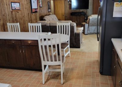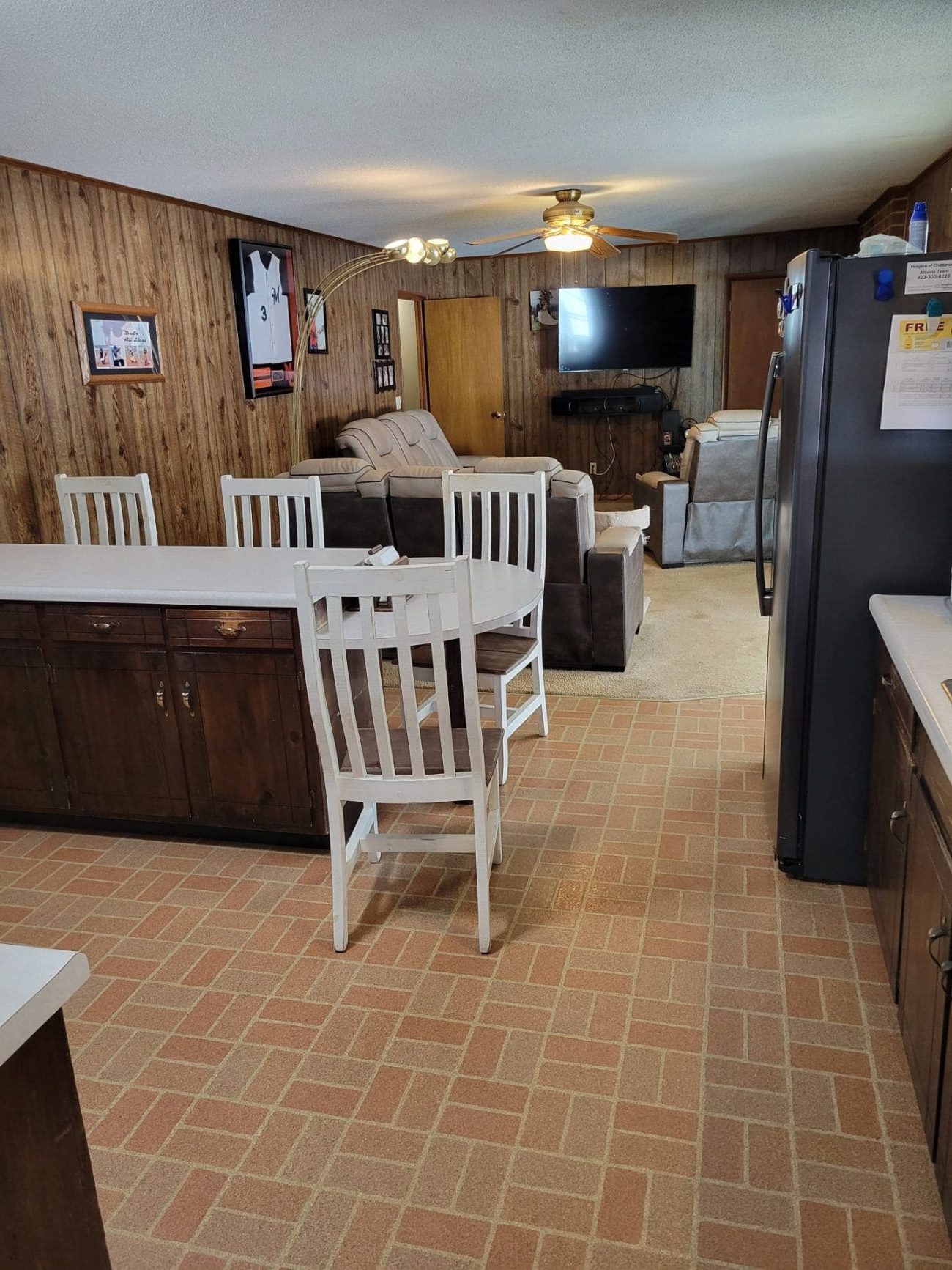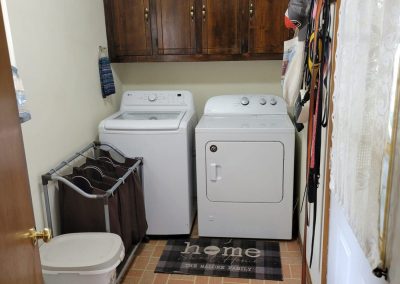 - Eat-in kitchen with breakfast bar seating and appliances remaining—including refrigerator, dishwasher, double oven (only the top oven functions), built-in cook top, over the range microwave, washer, gas dryer, and chest freezer in the basement