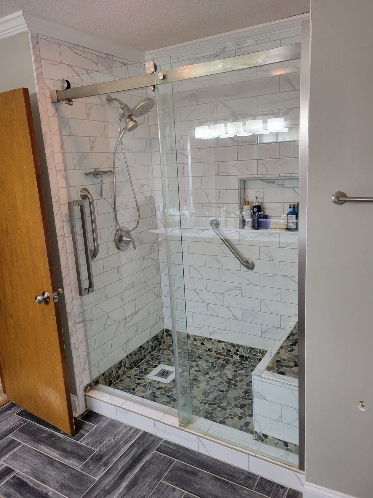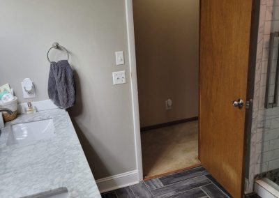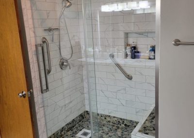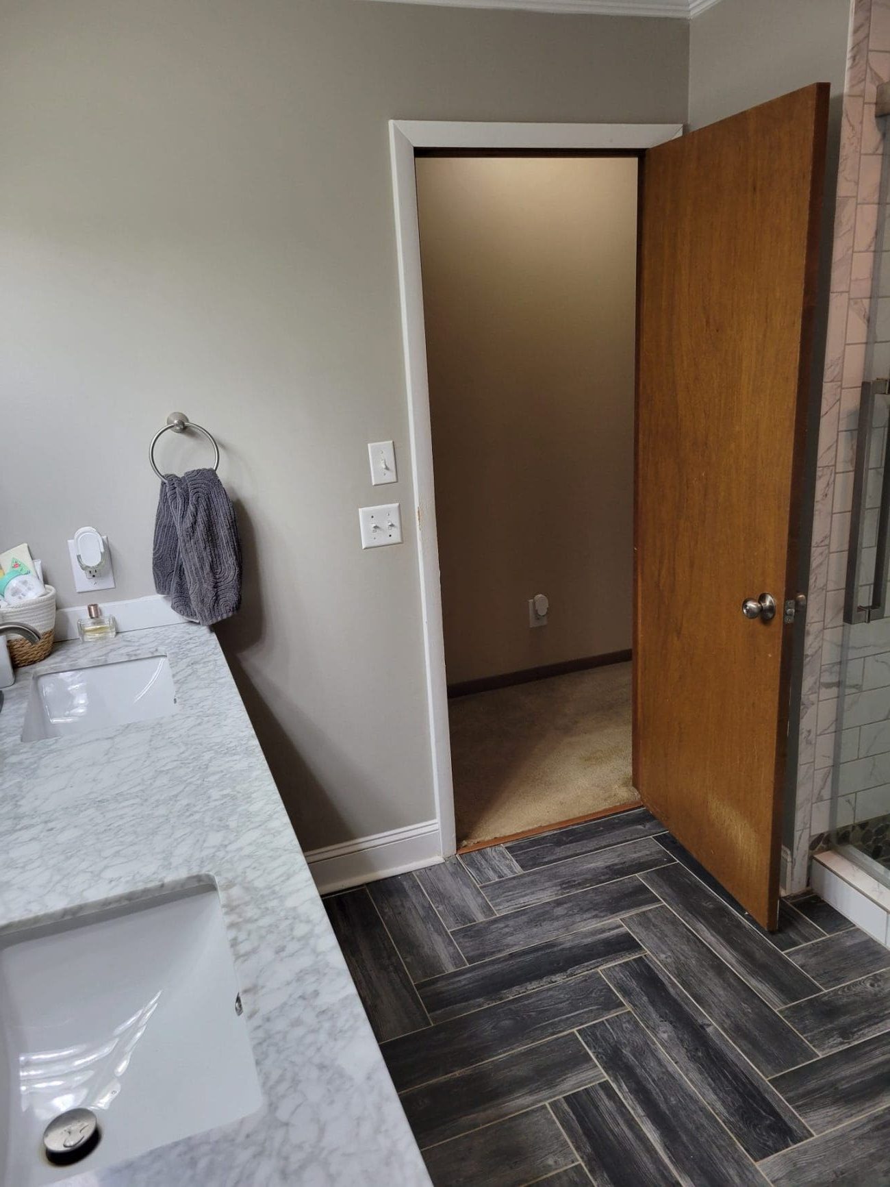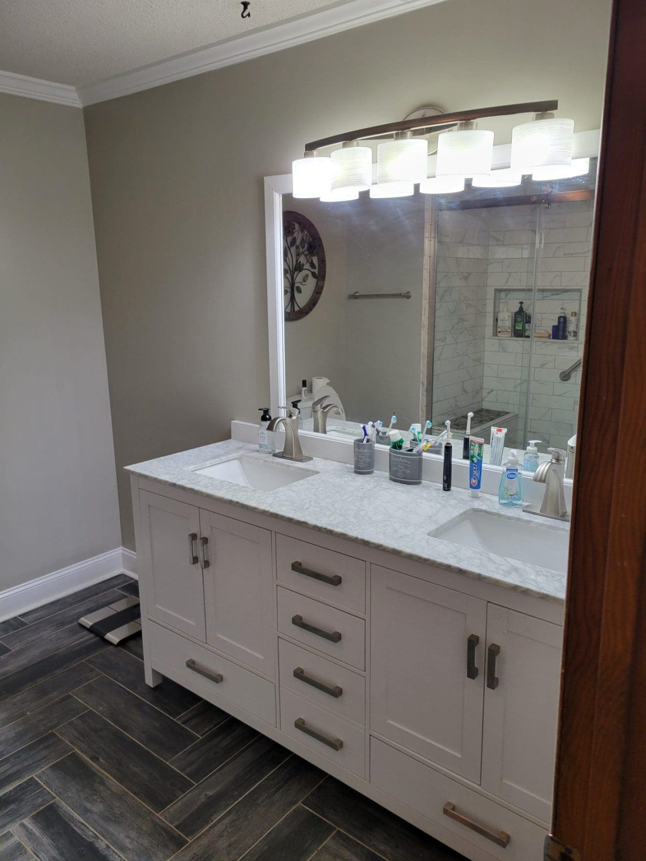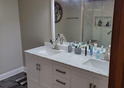 - Updated bathroom featuring custom tile walk-in shower and double sink vanity