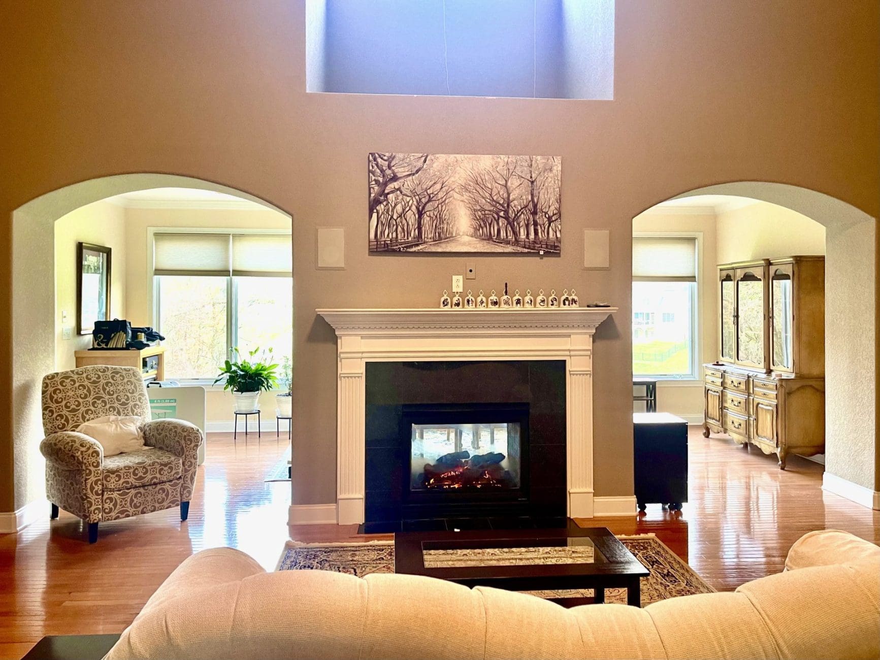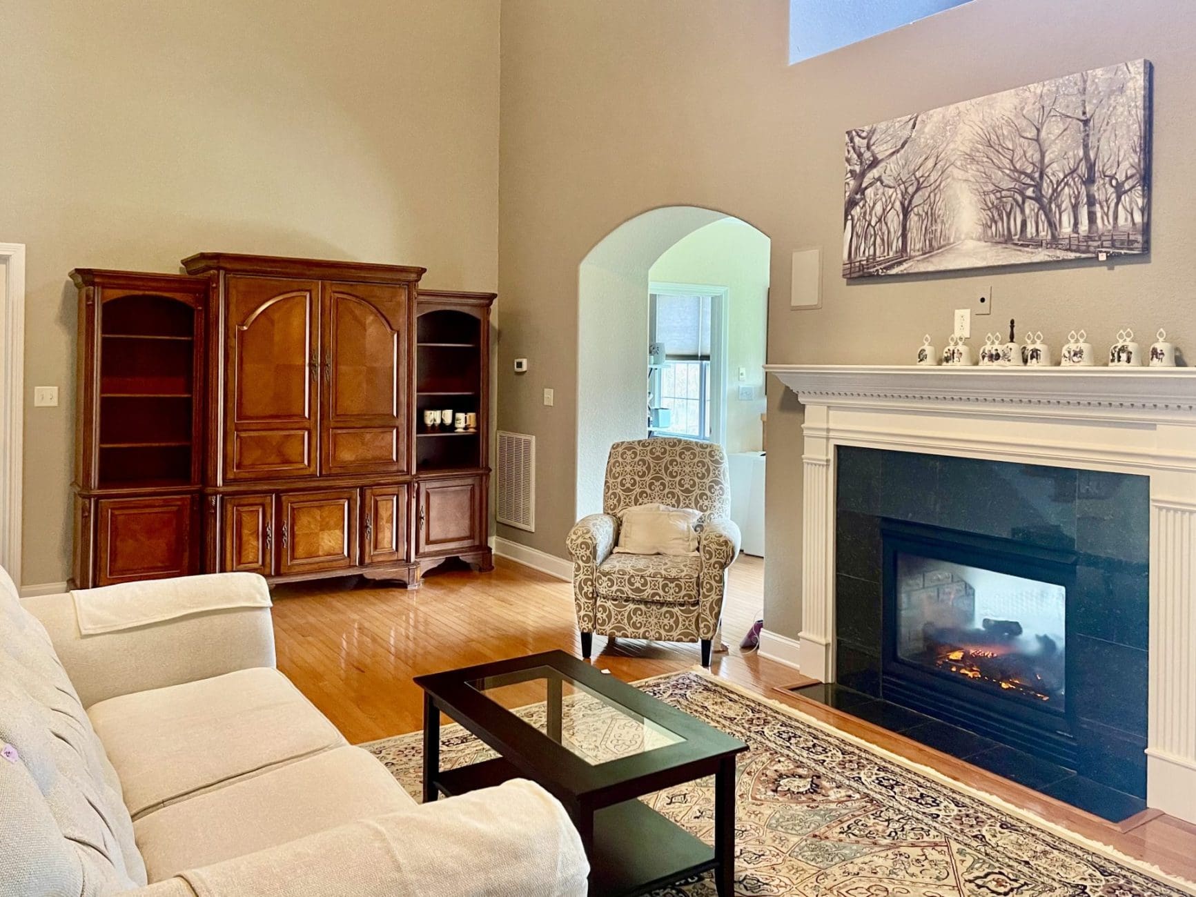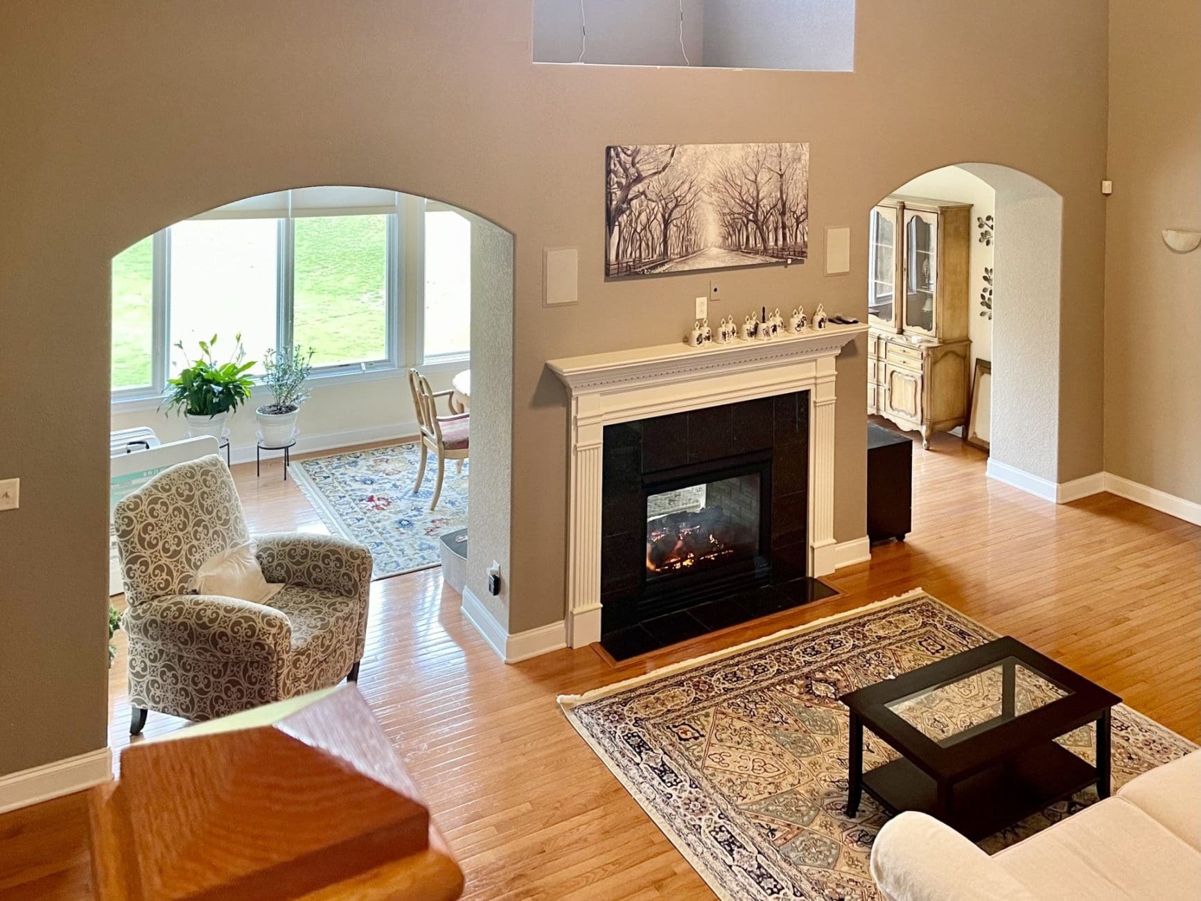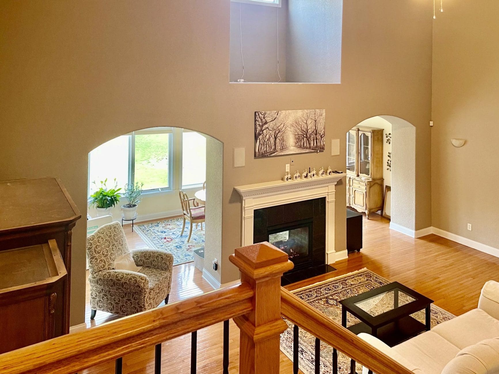 A large entrance foyer welcomes you into the home, where an arched doorway leads into the spacious living room anchored by the double-sided gas fireplace shared with the adjoining dining room. Double arched doorways connect the living and dining spaces, creating an effortless flow perfect for entertaining. The dining room features a wall of windows overlooking a large neighborhood common area, flooding the space with natural light. The kitchen is exceptionally appointed with: