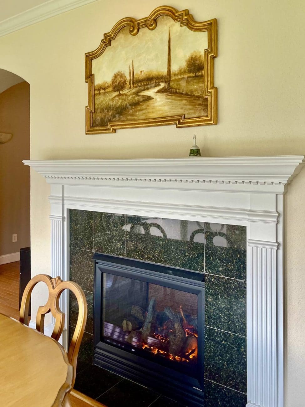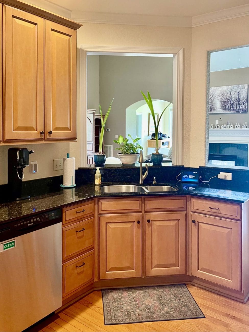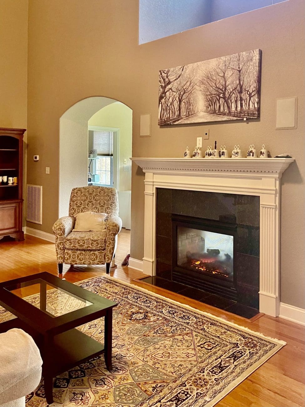 A large entrance foyer welcomes you into the home, where an arched doorway leads into the spacious living room anchored by the double-sided gas fireplace shared with the adjoining dining room. Double arched doorways connect the living and dining spaces, creating an effortless flow perfect for entertaining. The dining room features a wall of windows overlooking a large neighborhood common area, flooding the space with natural light. The kitchen is exceptionally appointed with: