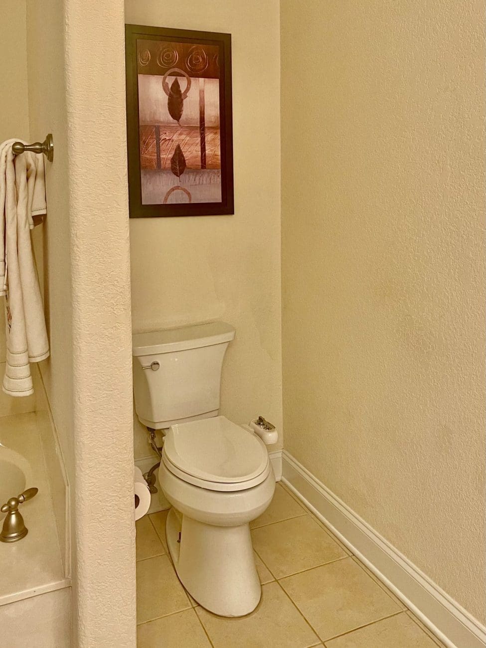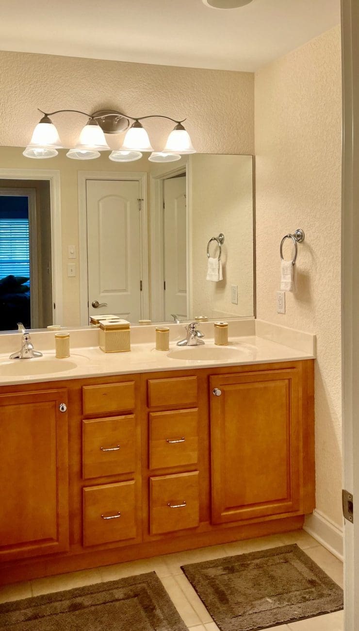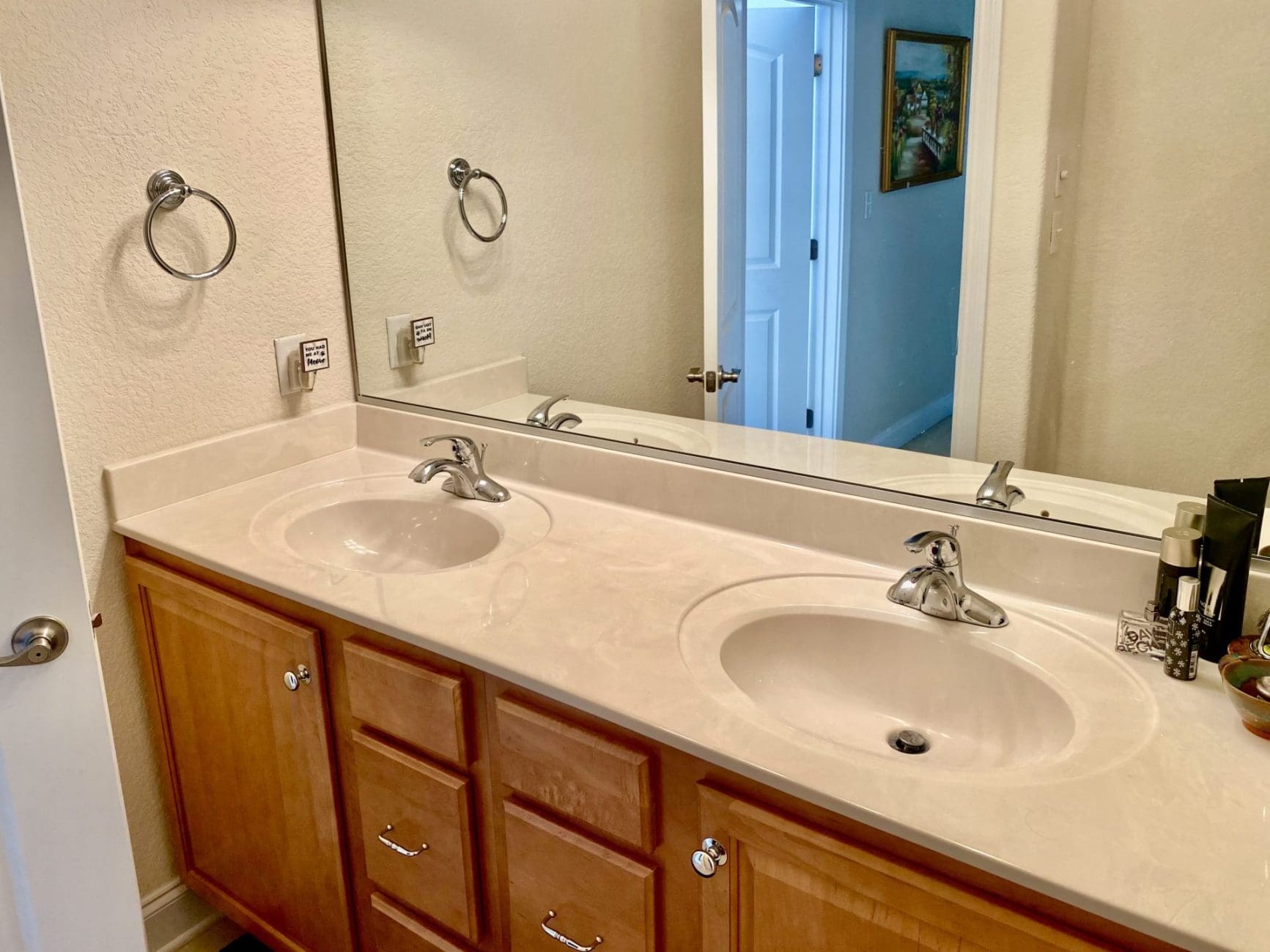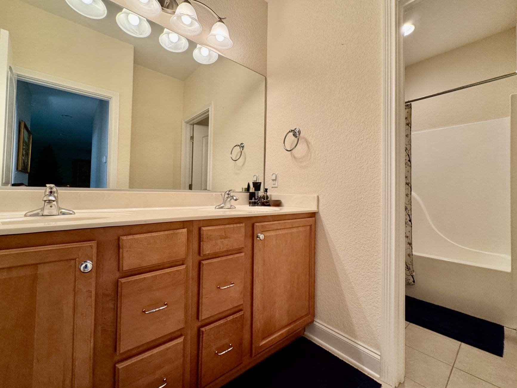 - Full bathroom with double-sink vanity and a separate private room housing the tub/shower combo and commode