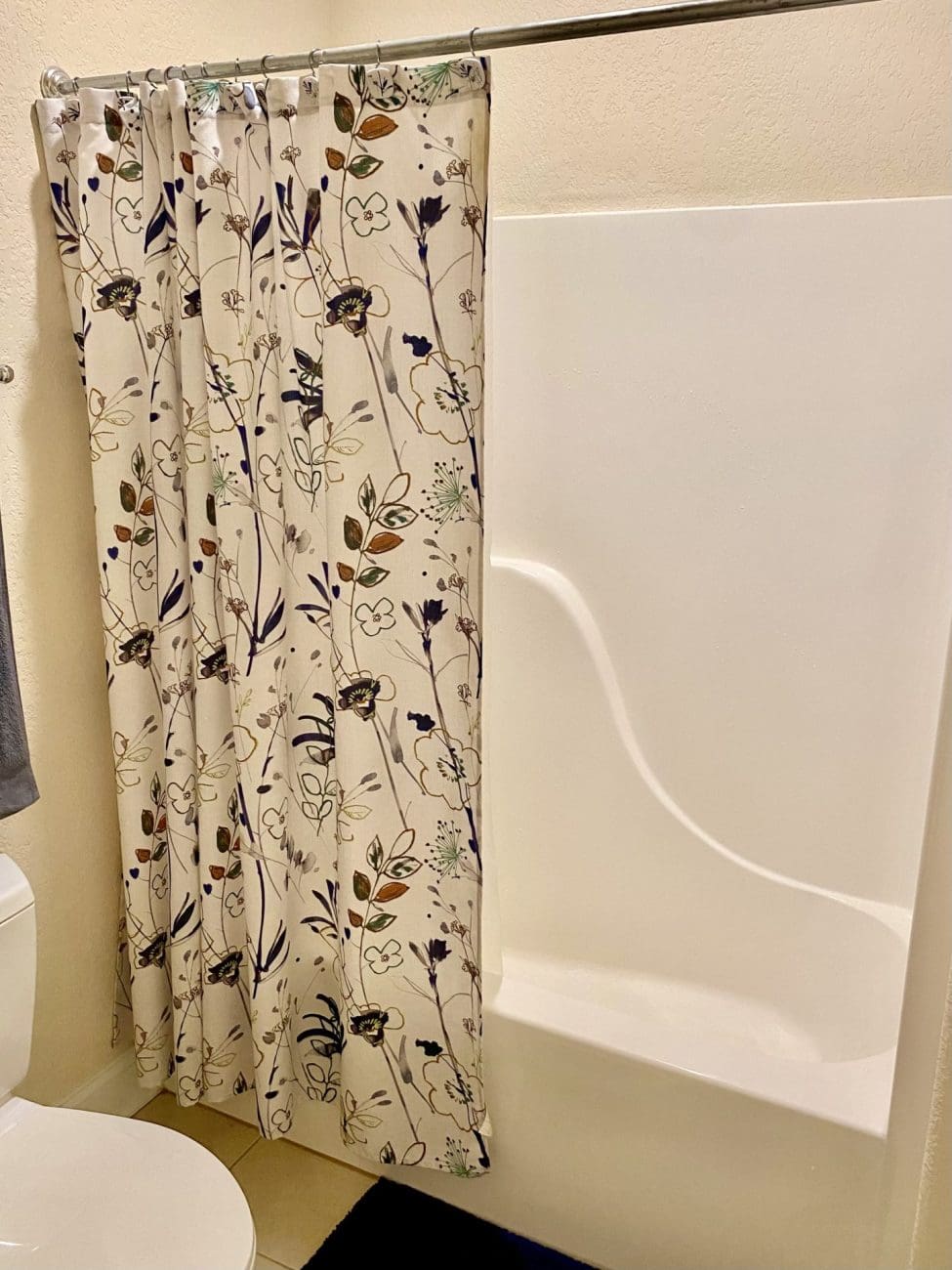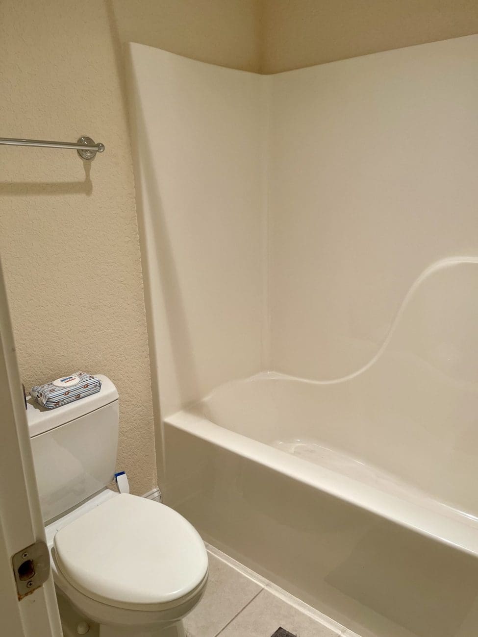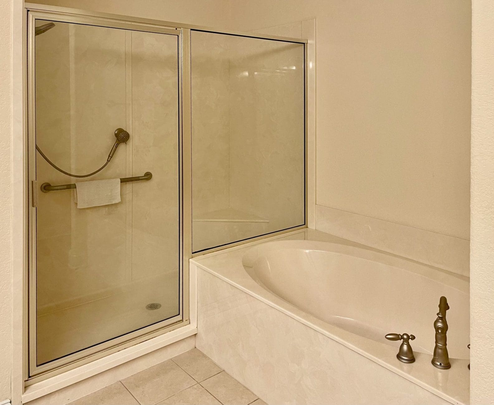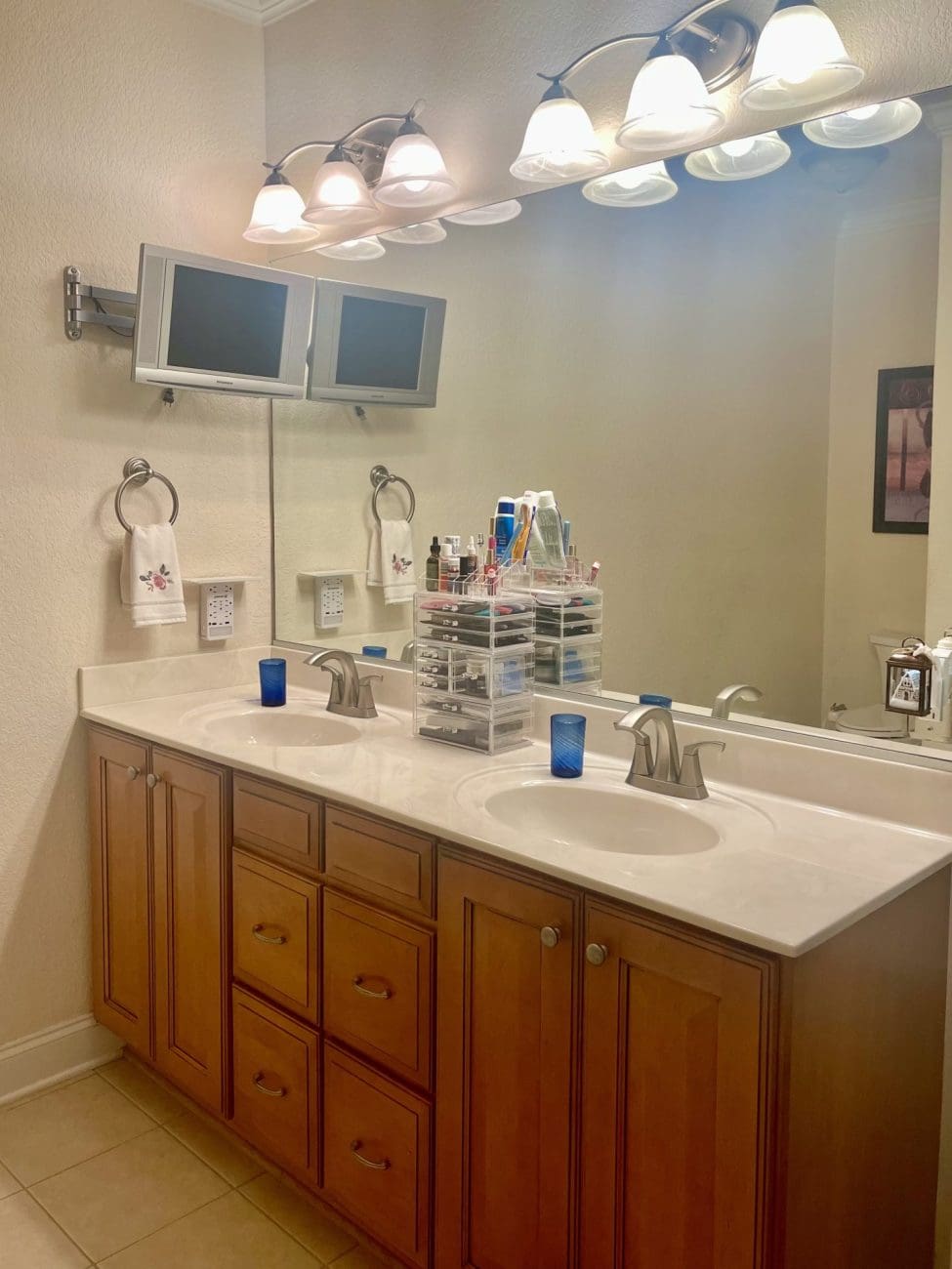 - Full bathroom with double-sink vanity and a separate private room housing the tub/shower combo and commode