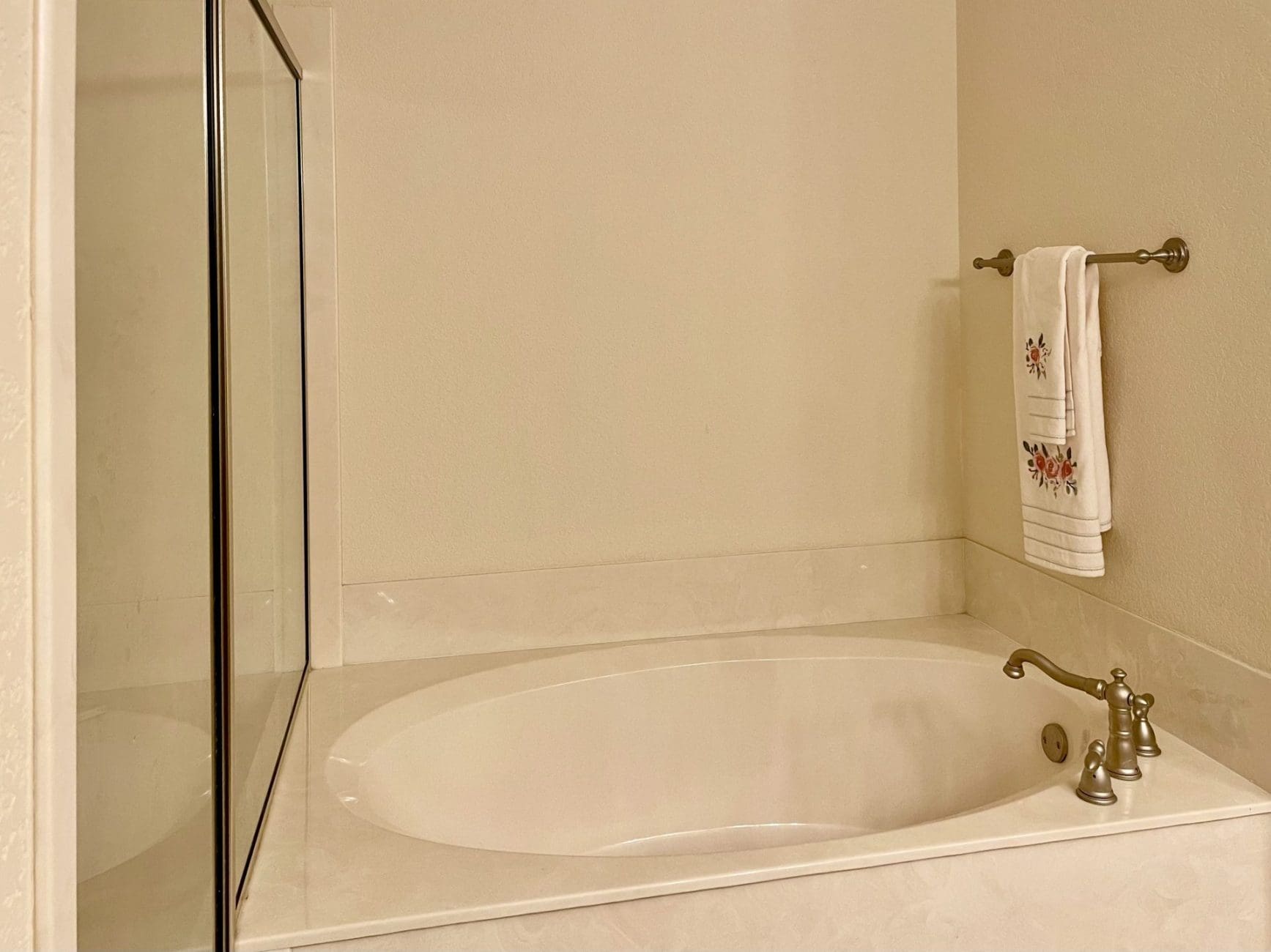 - En-suite bathroom with tile floor, soaking tub, walk-in shower, and double-sink vanity