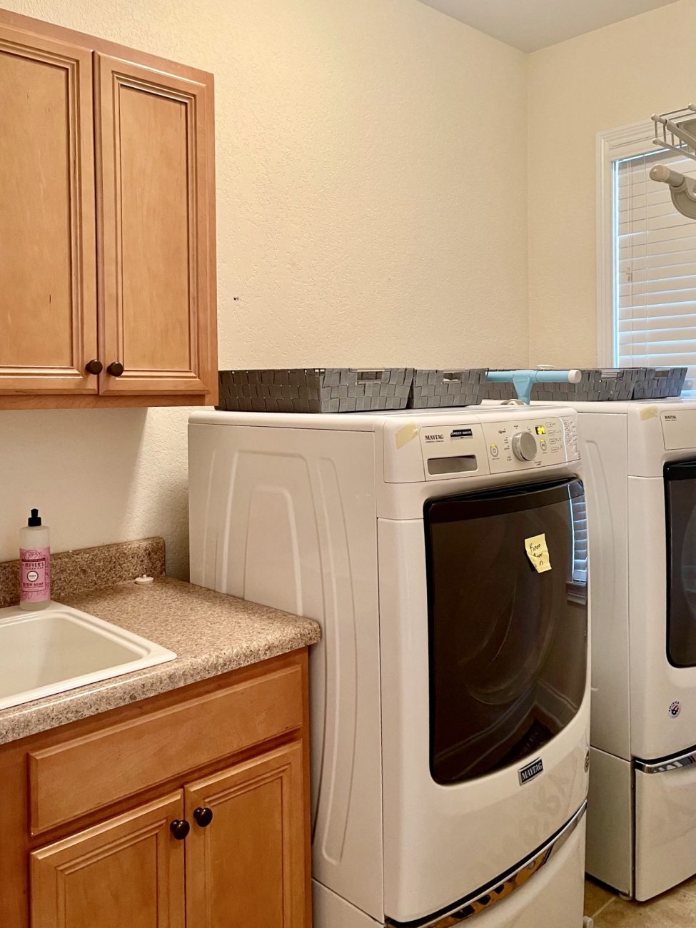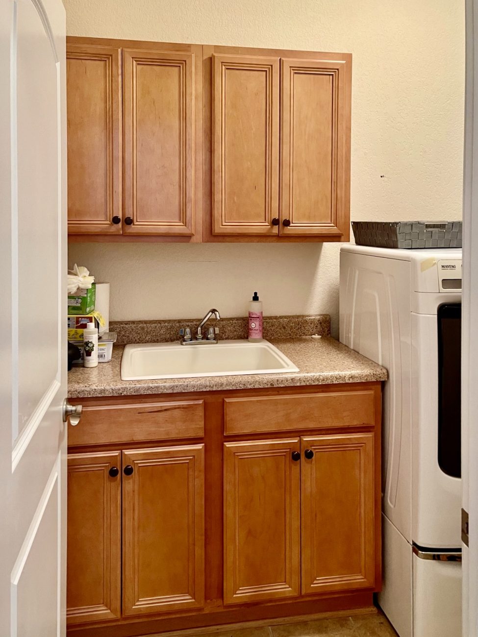 A spacious laundry room with laundry sink and cabinets and shelving, a half bathroom, and a coat closet complete the main level.
