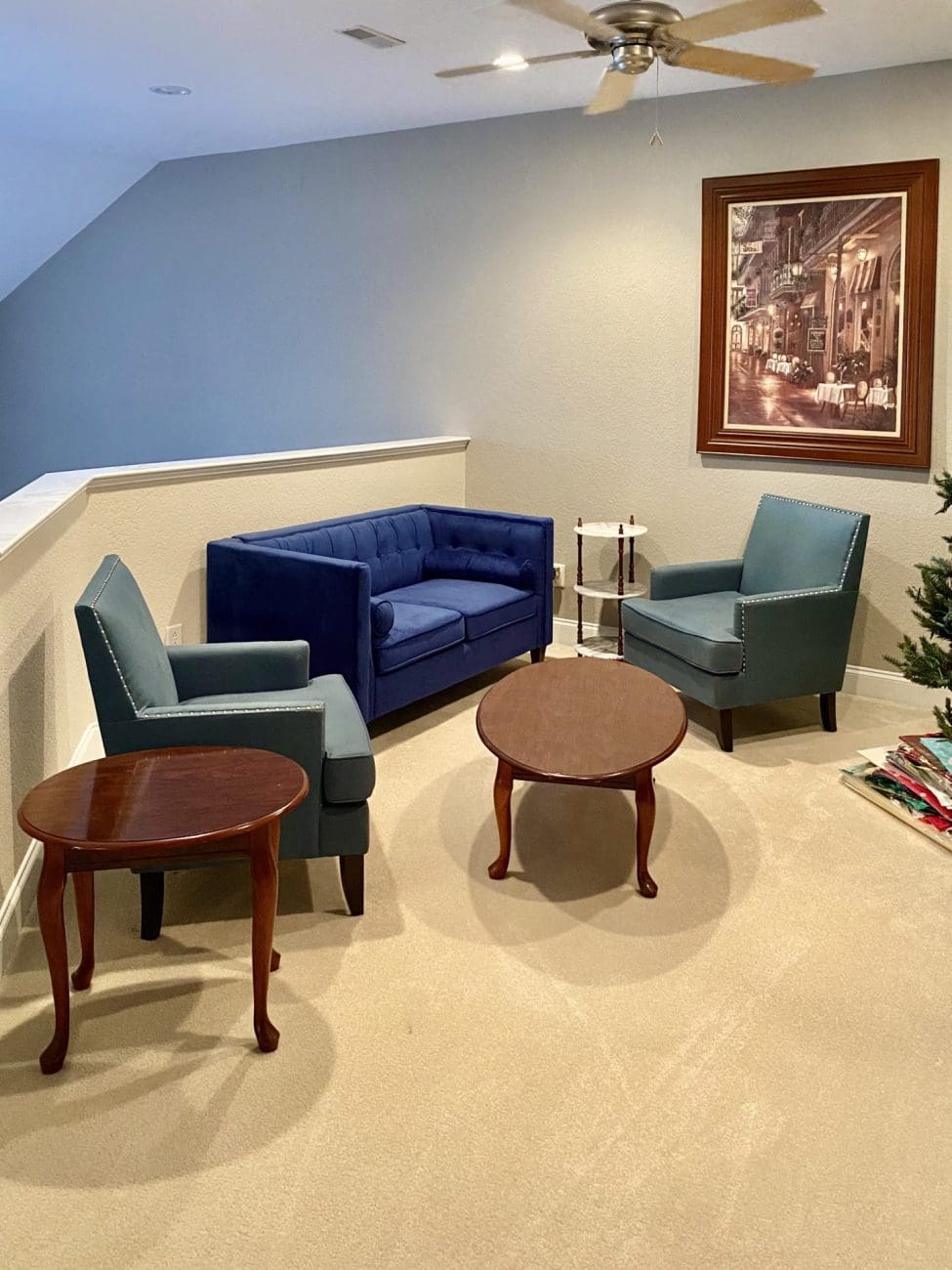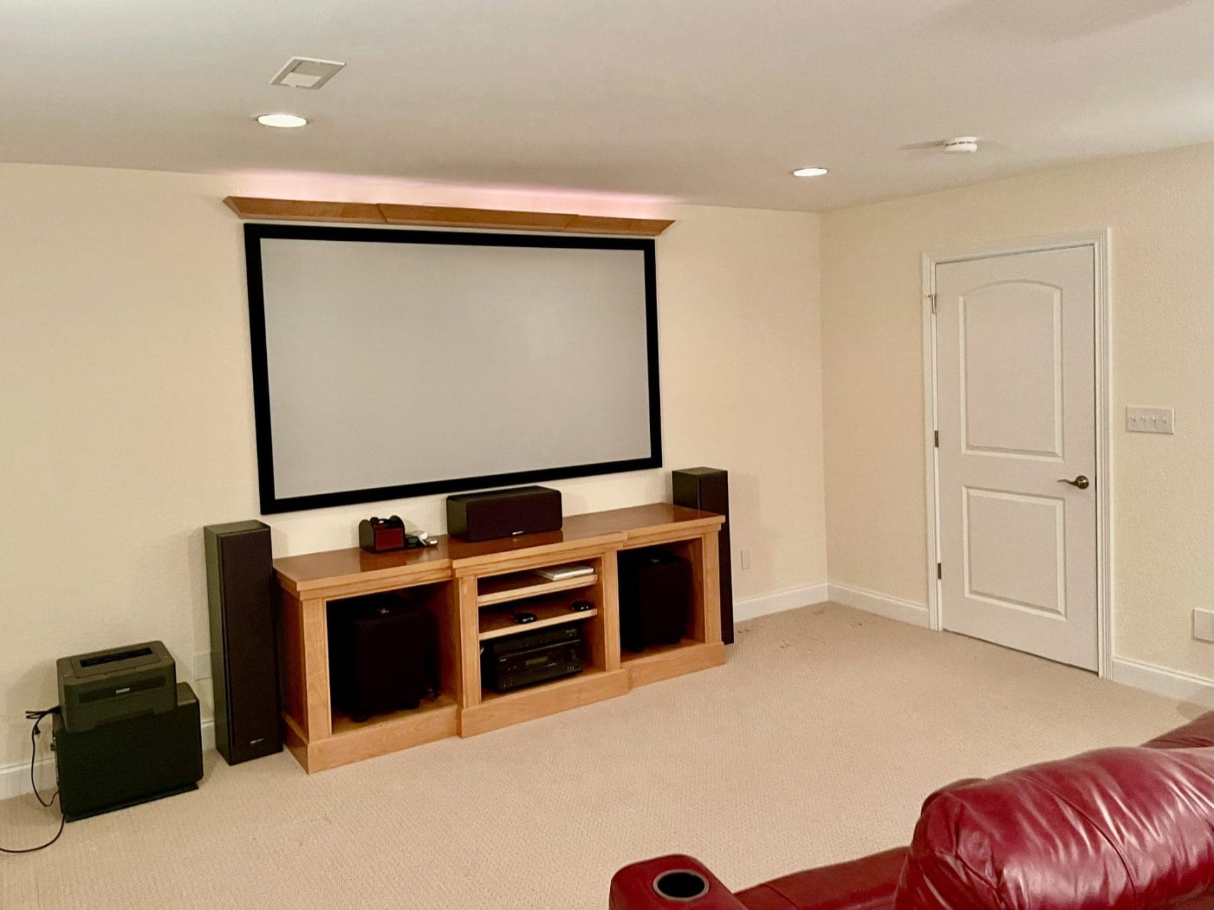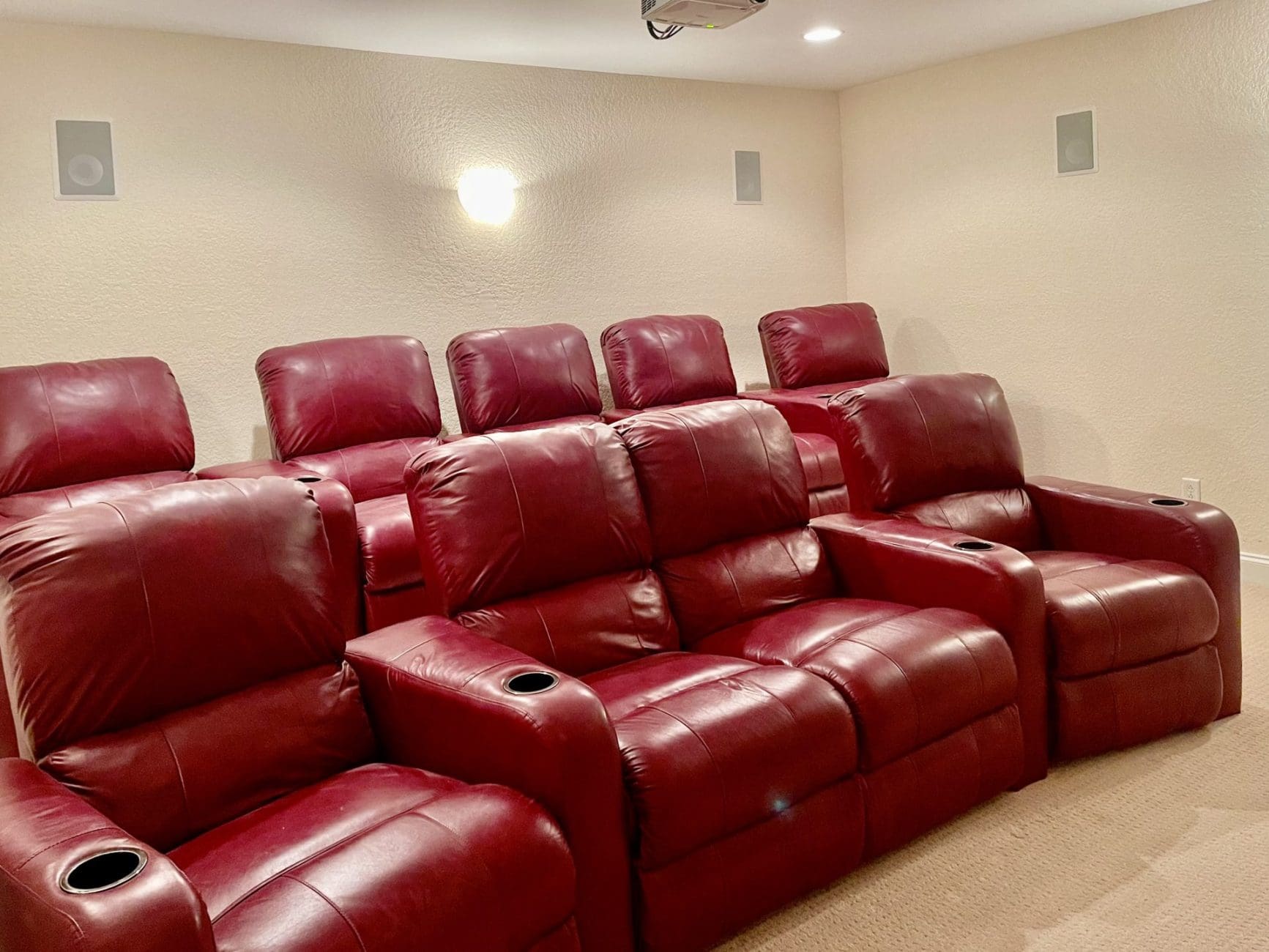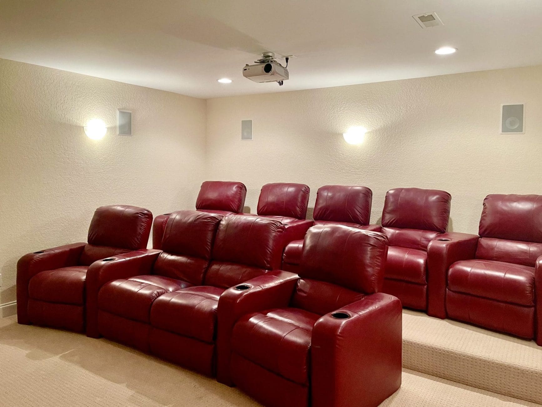 - Nine-seat home theater with oversized leather chairs, built-in entertainment unit, and projection screen TV with surround sound