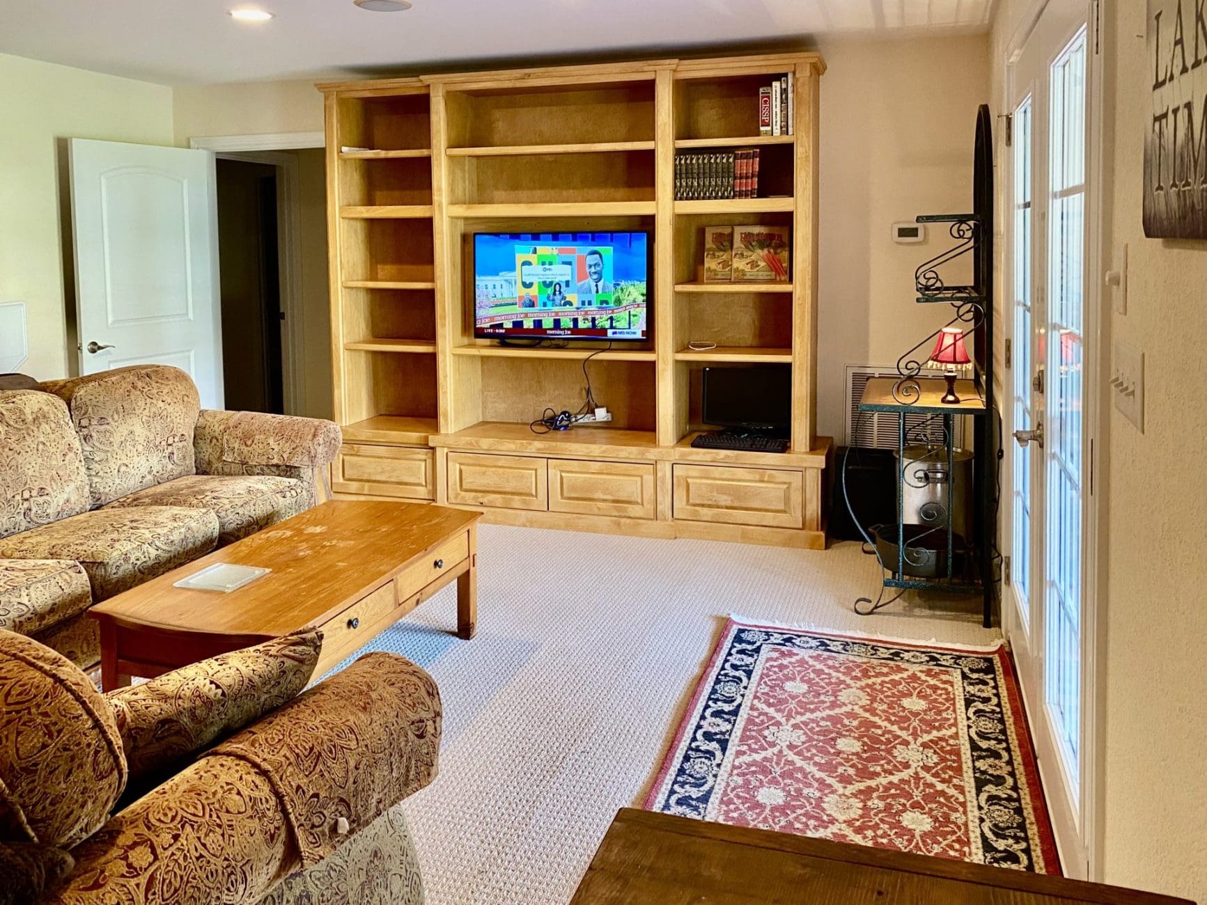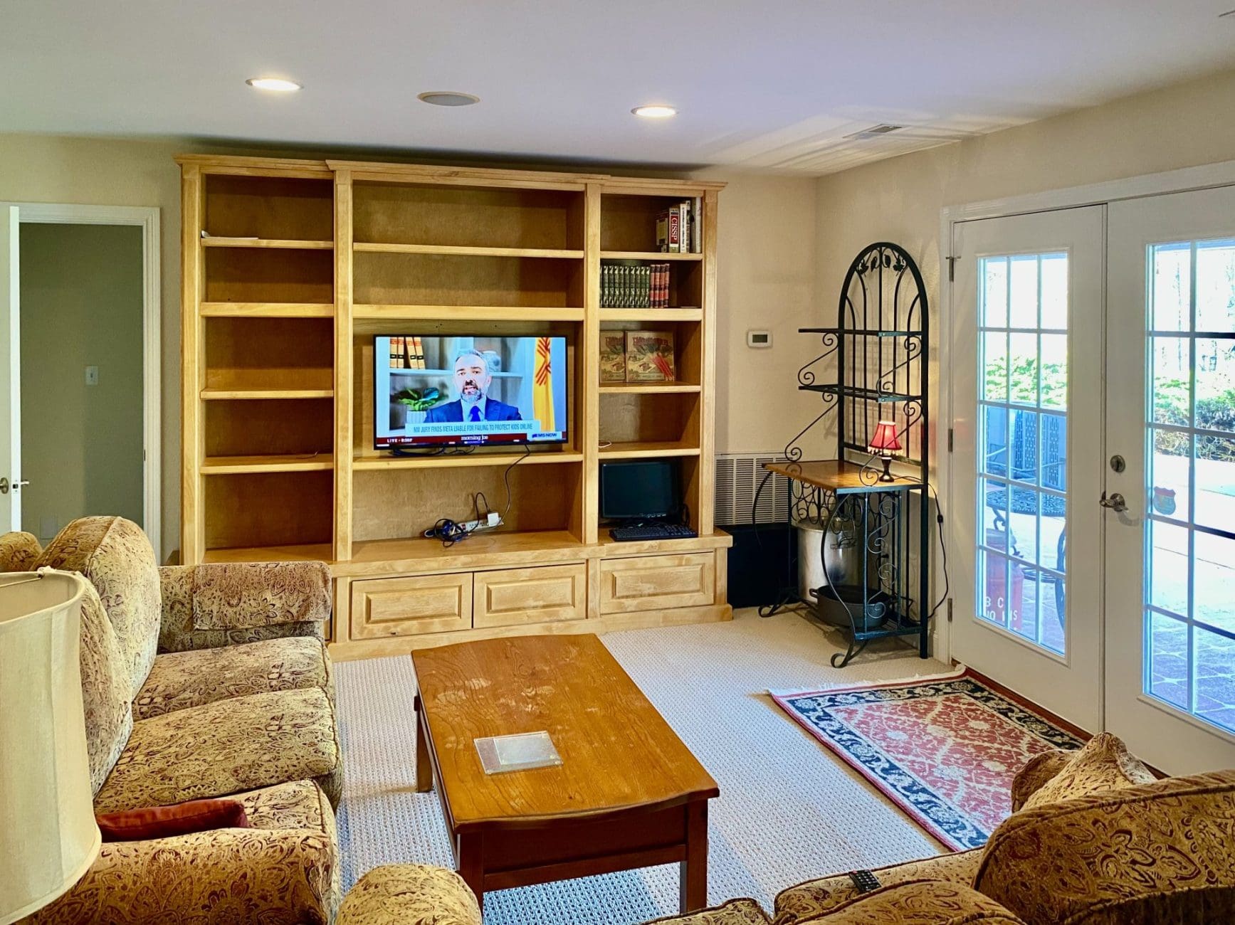 The fully finished basement is an entertainer’s dream and offers tremendous flexibility as a standalone suite for generational living, thanks to its own private exterior entrance. A large living and rec room with built-in entertainment cabinet and French doors opens to a covered rear patio with an extended patio beyond — plumbed for a gas grill and connected to the driveway by a convenient sidewalk. This level also features: