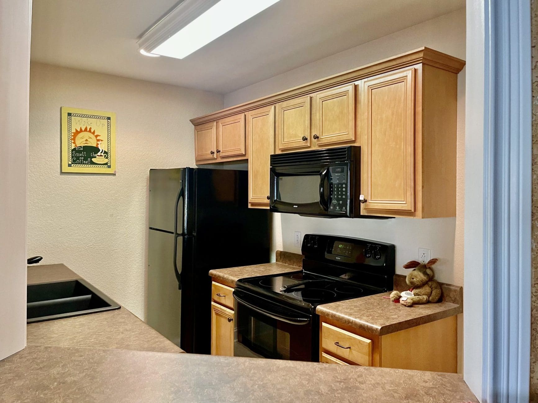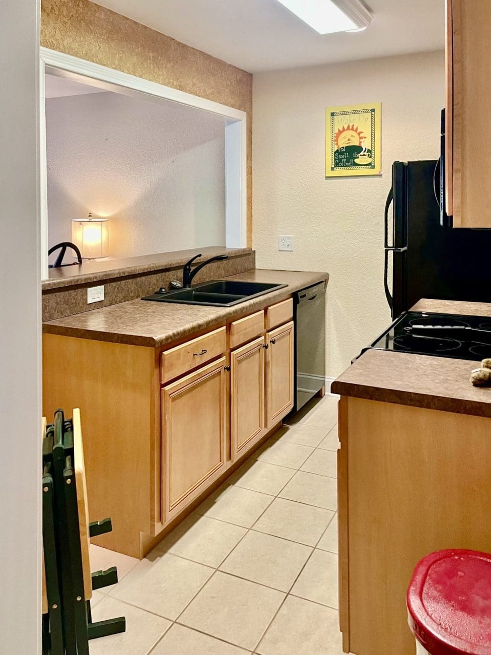 - Full kitchen with tile floor, sink, dishwasher, electric range, and refrigerator — open to the living area